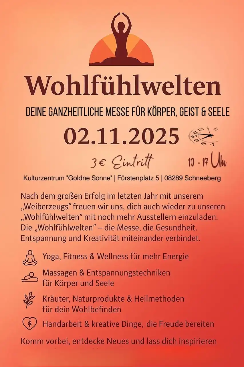 Nach dem großen Erfolg im letzten Jahr mit unserem „Weiberzeugs" freuen wir uns, dich auch wieder zu unseren „Wohlfühlwelten" mit noch mehr Ausstellern einzuladen.