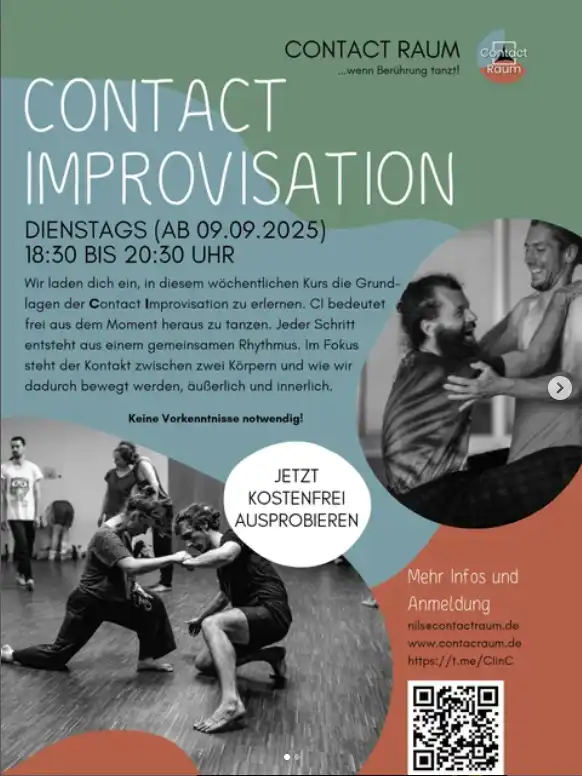 Contact Improvisation – Forschen, Spüren, Spielen · Eine Tanzform, so vielfältig wie wir selbst. Jede Bewegung entsteht aus dem Moment heraus. In Workshops und Kursen erforschen wir gemeinsam Nähe, Distanz und Begegnung – und wie sie unser Inneres berühren. Konsent und Integration sind dabei ebenso wichtig wie die Freude am Bewegen.