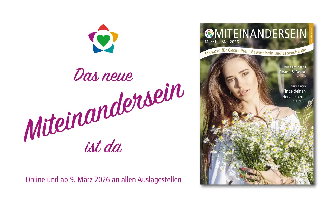 Mit der Frühlingssonne präsentieren wir voller Freude unsere Frühlingsausgabe des MITEINANDERSEIN-Magazins. Insbesondere die Beiträge unseres Sonderteils „Frühlings-Detox – frische Energie für Körper, Geist und Seele” laden Dich ein, die Frühlingsenergien zu nutzen, um Dich von altem Ballast zu befreien und mit voller Kraft und Gesundheit ins Leben zu treten.