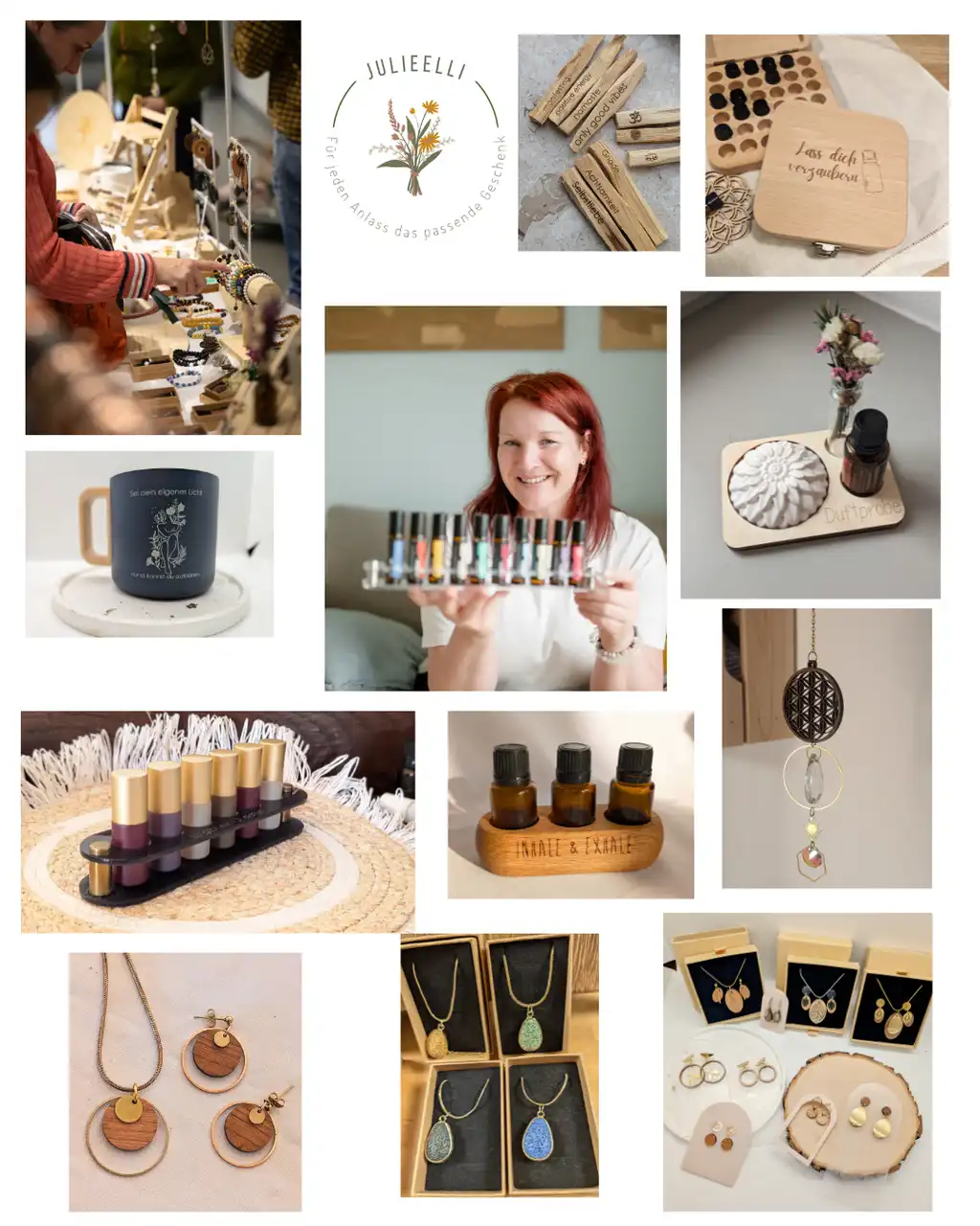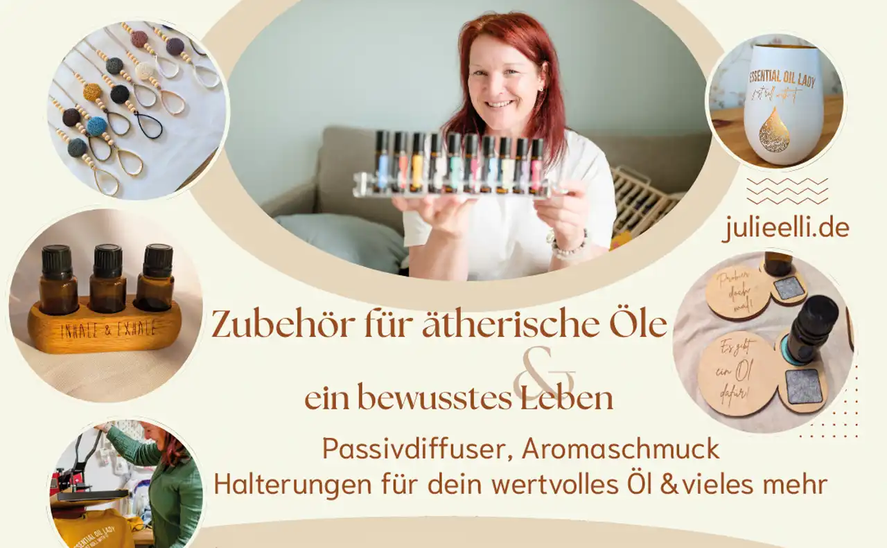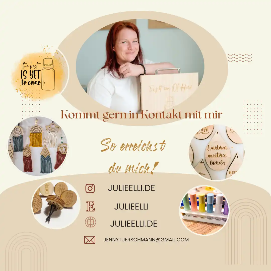 Jenny Türschmann · JulieElli Herzenswerke · Zubehör für ätherische Öle & spirituelle Deko, alles rund um deinen entspannten Moment, Halterungen für ätherische Öle, Passivdiffuser, Aromaschmuck, T-Shirts mit Statementsprüchen, Lasercut & Gravur · Etsy: julielli · Instagram.com/julieelli.de · Online-Shop Julieelli.de