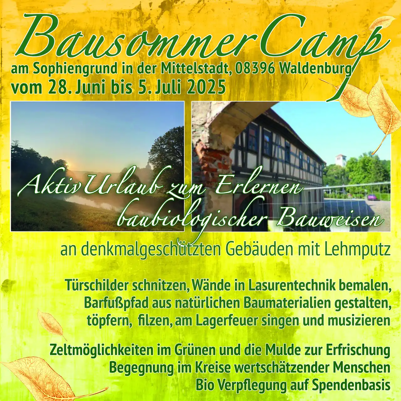 Zum Bausommercamp können Kinder, Jugendliche und Erwachsene mit und ohne Assistenzbedarf biologische Bauweisen erlernen und denkmalgeschützten Gebäude sanieren. Dabei erfahrt Ihr, wie mit Händen und Füßen Lehm gemischt und verputzt wird. Am Samstag beginnt der Aktiv-Urlaub mit dem Johannifest, welches wir als Luisenhof-Gemeinschaft mit einem Schauspiel und Johanni-Feuer feiern. Am Sonntag besuchen wir das Hoffest des Luisenhofes. Ab Montag können wir gemeinsam am Bau mitwirken. Außerdem sollen große Schilder geschnitzt, ein Raum in Lasurtechnik und mit Ornamenten bemalt, gefilzt, getöpfert und ein Barfußpfad zum sinnlichen Erleben der Baumaterialien angelegt werden. Gerne könnt ihr euch auch mit eigenen Fähigkeiten einbringen. Abends sitzen wir zum Singen, Musizieren und für bereichernde Gespräche am Feuer. Für Eure Mithilfe werdet Ihr mit bestem Bio-Essen versorgt und könnt an einem Wäldchen zelten. Gleich in der Nähe ist die Mulde, welche zur Erfrischung einlädt.