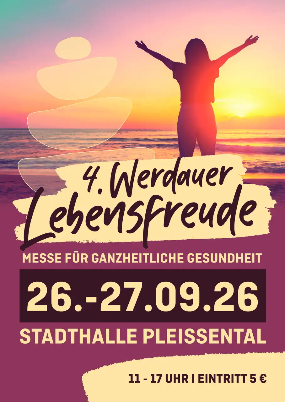 Tauche in die wohltuende Atmosphäre der 4. Werdauer Lebensfreude Messe ein – ein Raum, in dem Du Körper, Geist und Seele in Einklang bringen darfst. Freue Dich auf ein vielfältiges Programm voller Inspiration, praktischer Impulse und heilender Erfahrungen.