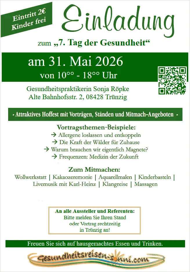 Gesundheitspraxis Sonja Röpke · Fastenleiterin, Gesundheitspraktikerin, Lebensberaterin, Fachberaterin: Hobby, Basteln, Werken, Wildkräuterwandern · 08428 Langenbernsdorf OT Trünzig · 0366 – 08654229 · www.gesundheitsreisen-sonni.com