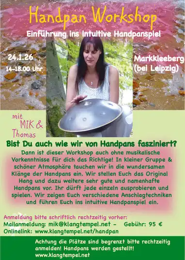 In kleiner Gruppe und schöner Atmosphäre tauchen wir in die wundersamen Klänge der Handpans ein. Wir stellen Euch unterschiedliche, sehr gute und namenhafte Handpans vor. Ihr dürft jede einzeln ausprobieren und spielen. Wir zeigen Euch verschiedene Anschlagtechniken und führen Euch in das intuitive Handpanspiel ein. Natürlich erfahrt ihr auch noch ein wenig Hintergrundwissen zu den Handpans und deren Entstehung. Eure Fragen beantworten wir gern.