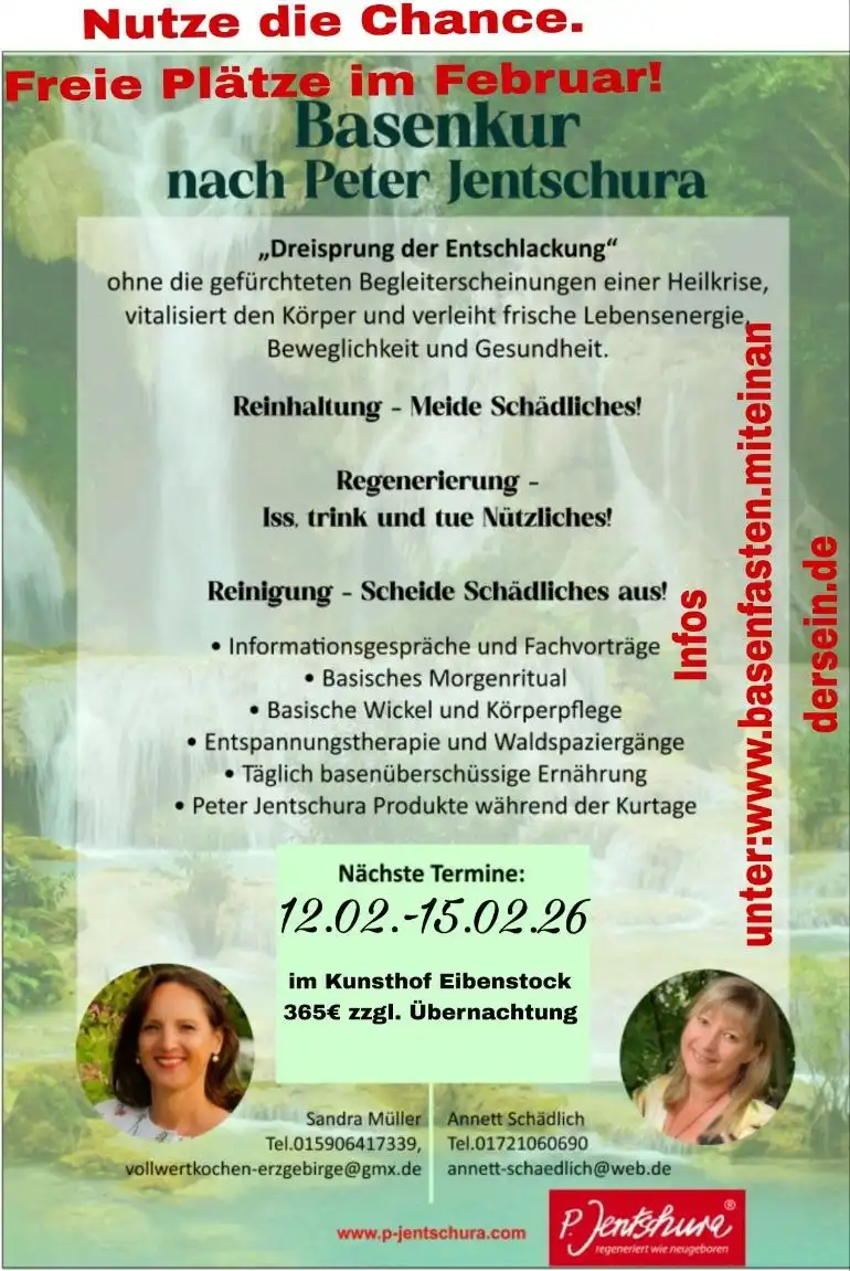Dies passiert ganz ohne die gefürchteten Begleiterscheinungen einer Heilkrise. Wir begleiten dich mit kulinarischen Geschmackserlebnissen, wichtigen Informationen zum Erhalt deiner Gesundheit, basischen Körperanwendungen, Entschlackungsmassagen, Entspannungstherapie und viel Freude im Wohlfühlambiente.