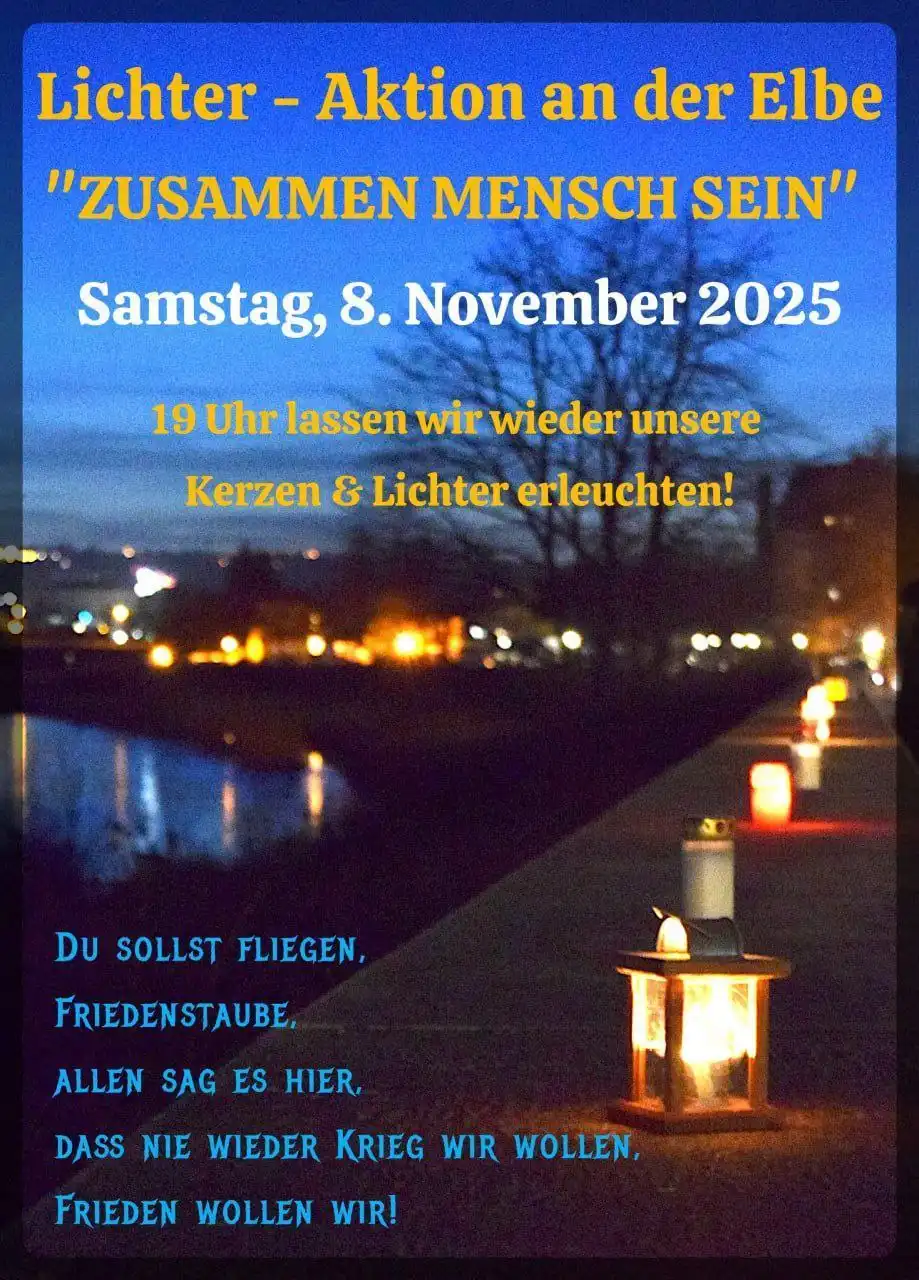 Für 30 Minuten wollen wir mit unseren Kerzen ein gemeinsames Zeichen setzen für FRIEDEN, FREIHEIT und WAHRHEIT entlang der ELBE von Tschechien bis über Pirna, Dresden, Meißen, Riesa und Magdeburg nach Hamburg.