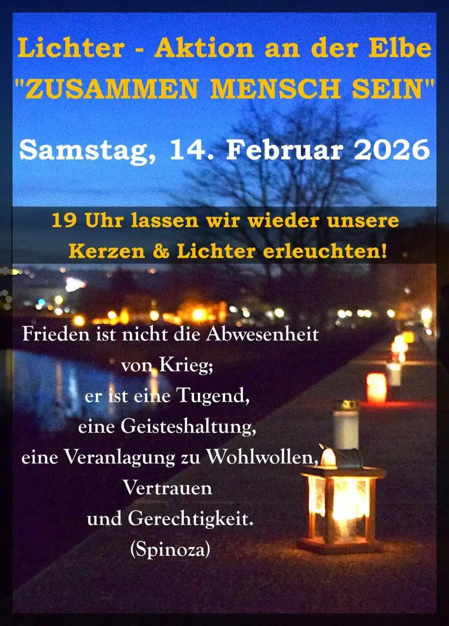 Für 30 Minuten wollen wir mit unseren 🕯🕯🕯 ein gemeinsames Zeichen setzen für FRIEDEN, FREIHEIT und WAHRHEIT entlang der ELBE von Tschechien bis über Pirna, Dresden, Meißen, Riesa und Magdeburg nach Hamburg.