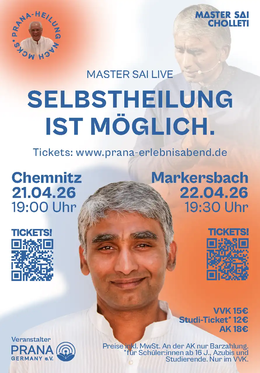 Selbstheilung ist möglich – unter diesem kraftvollen Motto kommt der international bekannte Yogamaster und spirituelle Lehrer Sai Cholleti am Dienstag, dem 21. April 2026, nach Chemnitz sowie am Mittwoch, dem 22. April nach Markersbach ins Erzgebirge. Der Erlebnisabend „Prana-Heilung“ verspricht, nicht nur zuzuhören, sondern Lebensenergie hautnah zu erfahren.