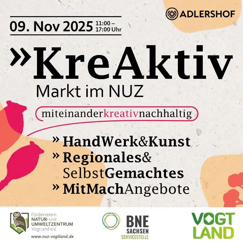 Handwerks-Kunst hautnah miterleben, tolle Mitmachangebote für Groß und Klein sowie zahlreiche Händler mit regionalen und selbst hergestellten Produkten erwarten Sie zu unserem KreAktiv-Markt im NUZ! Dabei können Sie Vieles über traditionelle und moderne Arbeitsweisen und den wahren Wert authentischer und nachhaltiger Waren erfahren. Kommen Sie vorbei zum Stöbern und Staunen und fertigen Sie bei zahlreichen KreAkivangeboten Selbstgemachtes zum Behalten und Verschenken. Für das leibliche Wohl ist gesorgt.