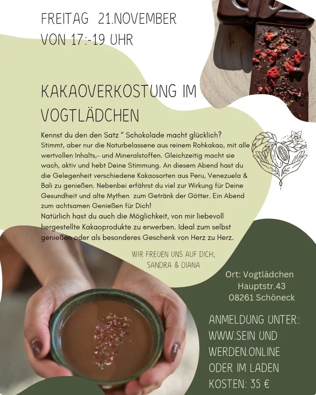 Kosten: 35 Euro inkl. verschiedenen zeremoniellen Rohkakao, vergünstigter Verkauf von Rohkakaoprodukten, Geschenken und einer Überraschung