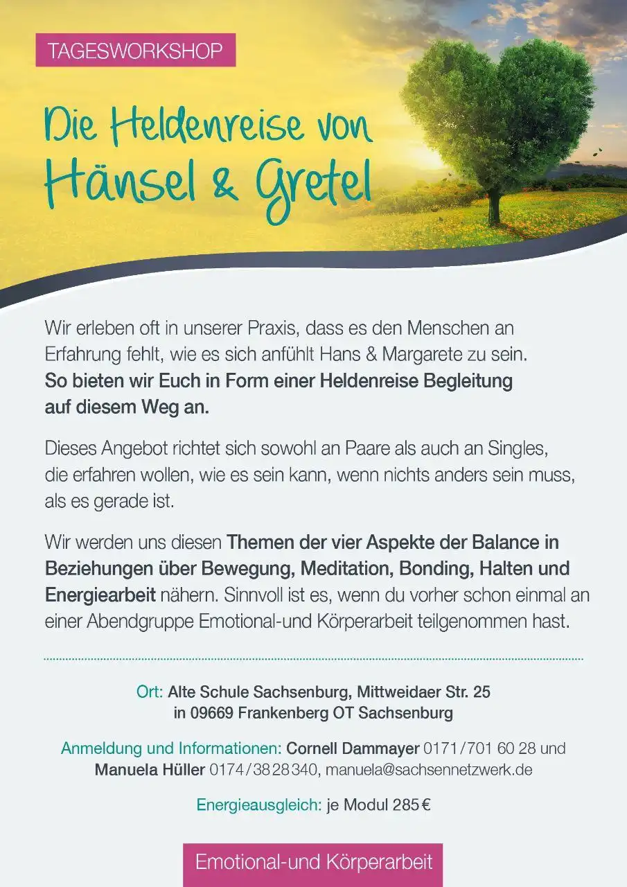Tagesworkshop Emotional- und Körperarbeit „Die Heldenreise von Hänsel & Gretel” – Balance in Beziehungen begleitet durch Klang