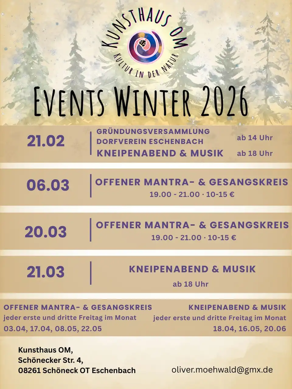 Oliver Möhwald · Kunsthaus OM · Konzerte, Workshops, Seminare, Theater · Schönecker Str. 4, 08261 Schöneck OT Eschenbach · Tel. + WhatsApp 0171 3740313 · Facebook · Instagram · Facebook Kunsthaus OM · Instagram Kunsthaus OM · Didgeridoo-Kurse · Wasser-Medizin: www.watsu.de