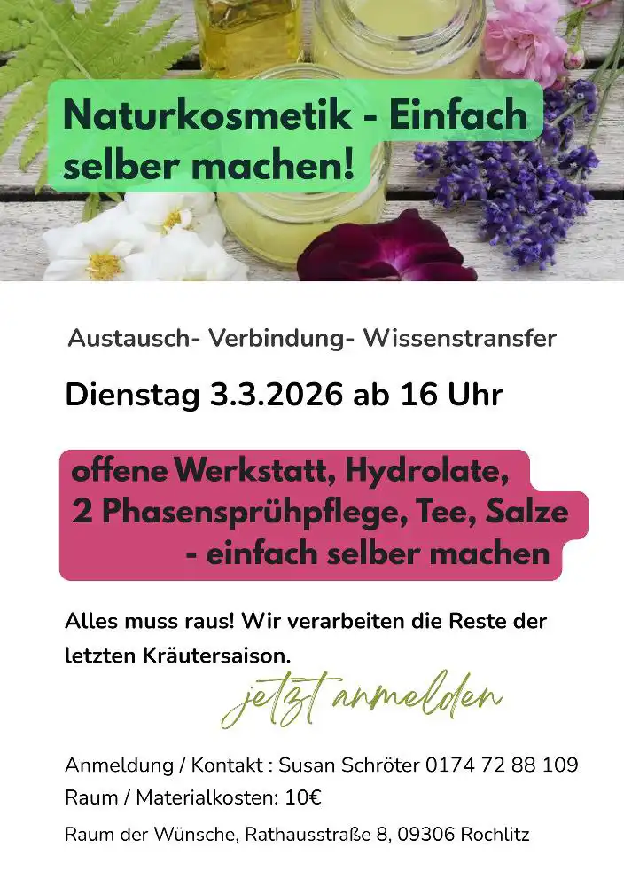 Raum der Wünsche · Bibliothek der Möglichkeiten · Raum für Austausch, Verbindung und Wissenstransfer, Frauenkreise, Naturkosmetik, Technik Cafe uvm. · Rathausstraße 8, 09306 Rochlitz · Susan Schröter · Tel. 0174 7288109 · raumderwuensche.rochlitz@gmail.com · Instagram: raum_der_wuensche_rochlitz