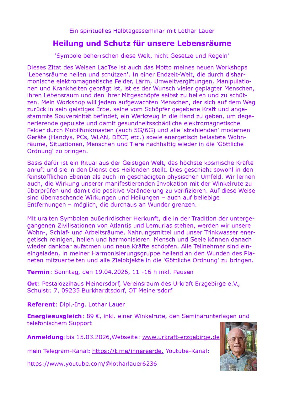 'Lebensräume heilen und schützen'. In einer Endzeit-Welt, die durch dishar-monische elektromagnetische Felder, Lärm, Umweltvergiftungen, Manipulatio-nen und Krankheiten geprägt ist, ist es der Wunsch vieler geplagter Menschen, ihren Lebensraum und den ihrer Mitgeschöpfe selbst zu heilen und zu schüt-zen. Mein Workshop will jedem aufgewachten Menschen, der sich auf dem Weg zurück in sein geistiges Erbe, seine vom Schöpfer gegebene Kraft und ange-stammte Souveränität befindet, ein Werkzeug in die Hand zu geben, um dege-nerierende gepulste und damit gesundheitsschädliche elektromagnetische Felder durch Mobilfunkmasten (auch 5G/6G) und alle 'strahlenden' modernen Geräte (Handys, PCs, WLAN, DECT, etc.) sowie energetisch belastete Wohn-räume, Situationen, Menschen und Tiere nachhaltig wieder in die 'Göttliche Ordnung' zu bringen.