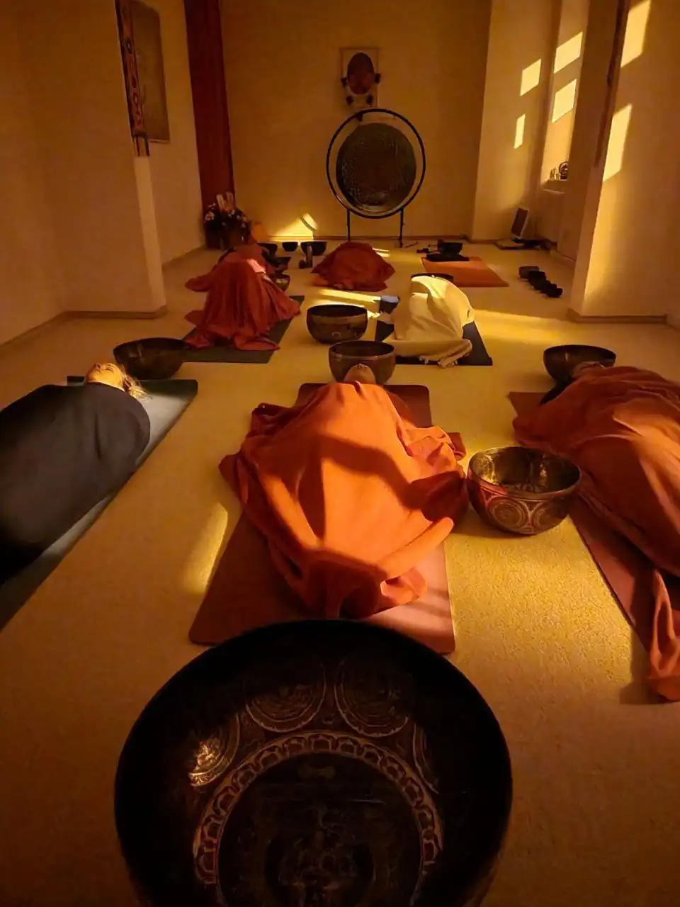 Die Klangmeditationen oder Klangreisen finden in Gruppen von 6 – 30 Leuten statt. Dabei liegen Sie auf einer bequemen Matte in Shavasana, der Tiefenentspannungslage auf dem Rücken. Das möglichst regungslose Ruhen ist wichtig, damit Sie in einen tiefen meditativen Zustand gelangen. Während der Klangmeditation konzentrieren Sie Ihren Geist auf die Klänge sowie Ihren Atem und fühlen sich wie in einem “Klangbad”, in dem Sie vollkommen entspannen können.