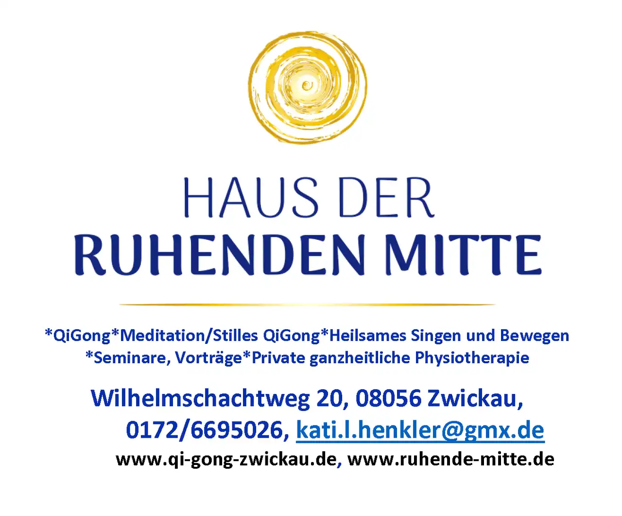 Haus der ruhenden Mitte · Kati Henkler · QiGong, Meditation / stilles QiGong, Heilsames Singen und Bewegen, Klangheilung, Workshops und Retreats · Ganzheitliche private Physiotherapie · Wilhelmschachtweg 20, 08056 Zwickau · Tel. 0172 6695025 · kati.l.henkler@gmx.de · www.ruhende-mitte.de