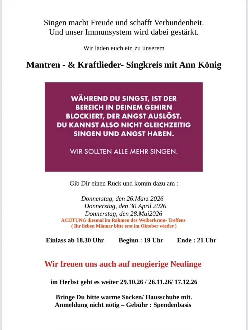 Sondertermin: 28.5. Weiberabend... „Wie Musik und Singen uns stärkt”, Gebühr: 15 €