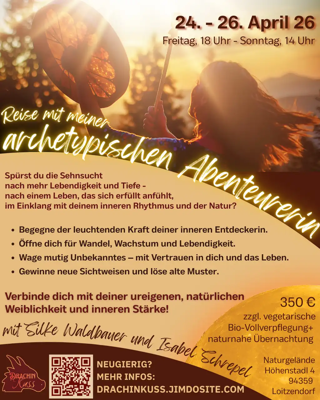 Gedanken und Energien, die damit zusammenhängen, weisen dir den Weg, neue Türen zu öffnen, Entscheidungen zu treffen und deinen Weg authentischer zu gestalten. Wir sind an deiner Seite, halten sichere Räume und begleiten dich auf deiner Reise. Gleichzeitig bist du getragen im Kreis deiner Gefährtinnen, die dir mit der Zeit immer vertrauter werden. Mit der Energie des Frühlings feiern wir zum Abschluß deine erstarkte, archetypische Abenteurerin.