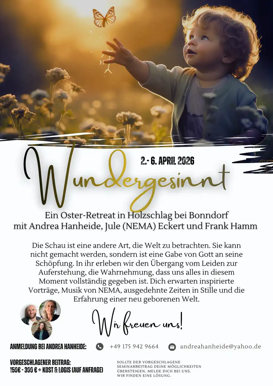 Die Schau ist eine andere Art, die Welt zu betrachten. Sie kann nicht gemacht werden, sondern ist eine Gabe von Gott an seine Schöpfung. In ihr erleben wir den Übergang vom Leiden zur Auferstehung, die Wahrnehmung, dass uns alles in diesem Moment vollständig gegeben ist. Dich erwarten inspirierte Vorträge, Musik von NEMA, ausgedehnte Zeiten in Stille und die Erfahrung einer neu geborenen Welt.
