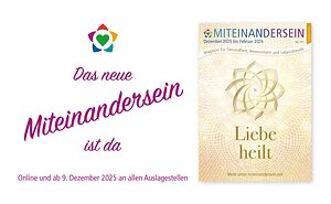 Liebe Partner & Freunde, voller Freude stellen wir Dir die besondere 111. Ausgabe des MITEINANDERSEIN-Magazins für den Winter 2025/26 vor. Lass Dich von tiefgründigen Beiträgen, inspirierenden Porträts und unserem zentralen Thema: „Liebe heilt” inspirieren…