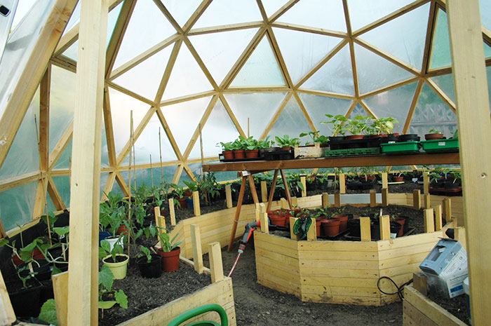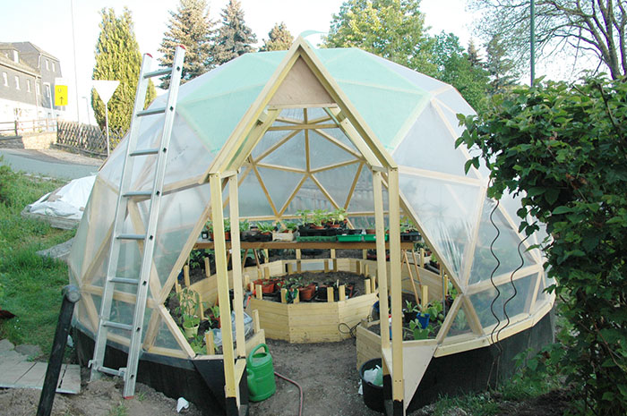 Alles in allem hat der Bau der Kuppel als Prototyp mit wetterbedingten Pausen gut einen Monat gedauert. Würde ich die Teile maschinell vorbereiten und mit besserem Material arbeiten, ginge das Ganze wesentlich schneller. Folie werde ich in dieser Form nie mehr verwenden. Das Konstrukt kann sowohl mit Plexiglas, echtem Glas oder Doppelstegplatten überzogen werden. Das ist eine Frage des Budgets. Verwende ich für die Füllungen Holzplatten statt Glas, wird aus dem Gewächshaus eine geschlossene Kuppel für welche Verwendung auch immer – Gartenlaube, Geräteschuppen, Klangkuppel… was immer Dir vorschwebt. Fenster einzubauen ist möglich, habe ich auch im Gewächshaus gemacht, wegen der Belüftung im Sommer. Die Türe ist einfach nur das „Loch“ des fehlenden Sechsecks im Bodenring der Kuppel. Da kann auf verschiedene Art und Weise eine Türe eingebaut werden.