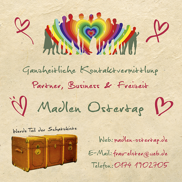 Mein Name ist Madlen Ostertag und es ist mir eine Herzensangelegenheit, Menschen zu verbinden. Durch meine Kontaktvermittlung bin ich behilflich, das passende Seitenstück zu finden. Ob Herzenspartner, Reisebegleitung oder Jobs der neuen Zeit – gern begleite ich Euch ganzheitlich bei der Suche.