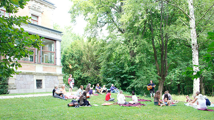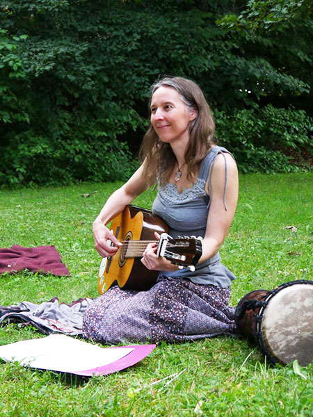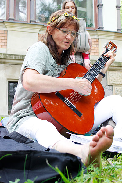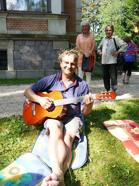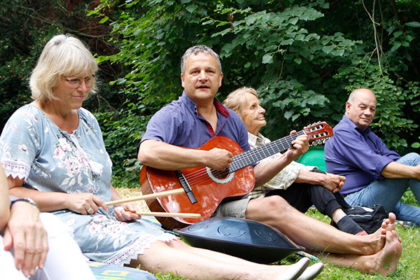 Danach haben wir im Außengelaende musiziert. Einige hatten ihre Instrumente mit und haben uns zum Mitmachen animiert.