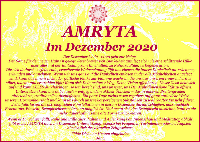 Wenn es Dir schwer fällt, Ruhe und Stille auszuhalten und Ablenkung von Innenschau und Meditation abhält, gibt es bei AMRYTA auch im Dezember Unterstützung und Begleitung, ebenso bei Fragen, in Turbulenzen oder bei Ängsten hinsichtlich des aktuellen Zeitgeschens.