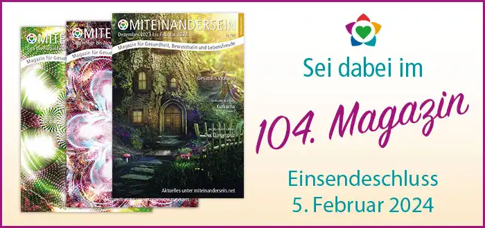 Liebe Partner und Freunde, mit den allerbesten Wünschen für Dich und Deine Vorhaben starten wir in das neue Jahr 2024 und die Planung des nächsten MITEINANDERSEIN-Magazins. Unsere inspirierende Frühlingsausgabe (März bis Mai 2024) wird Anfang März mit einer Auflage von 7000 Exemplaren an über 550 Stellen in Mittel- und Norddeutschland verteilt. Nutze diese Chance, bekannter zu werden und sei dabei. Unsere lieben Leser freuen sich schon darauf, dass Sie Dich mit Deinen exklusiven, ganzheitlichen Angeboten näher kennen lernen und dadurch zu Dir finden können.